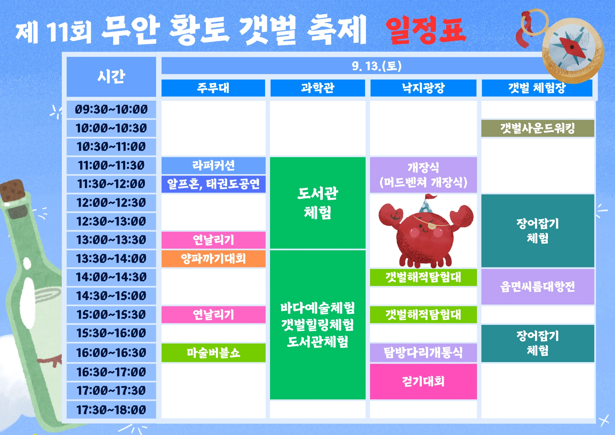 | 축제 일정 & 장소 | 2025년 9월 13일(금) ~ 9월 21일(일), 무안황토갯벌랜드, 전라남도 무안군 해제면 황토갯벌길 88 |